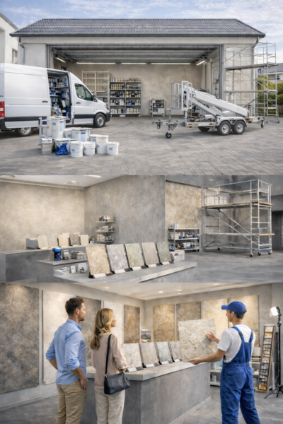 showroom deko stěrek, kde klienti mohou vybírat finální designové řešení •
